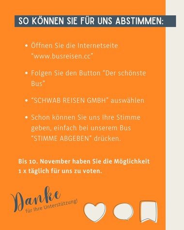 Wir nehmen dieses Jahr wieder beim Wettbewerb "der schönst Bus" teil. Bis 10. November haben Sie die Möglichkeit 1 x täglich für uns zu voten.
